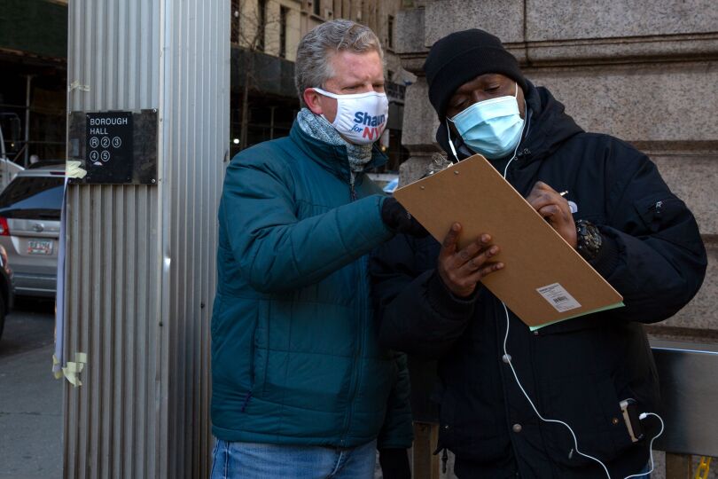 Shaun Donovan, a former city and national housing leader, gathers signatures in Downtown Brooklyn to get on the ballot for mayor, March 2, 2021.