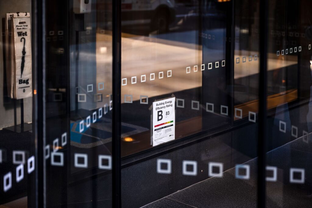 An energy efficiency rating sign on an office building at 50th Street in Manhattan. Nov. 5, 2021.