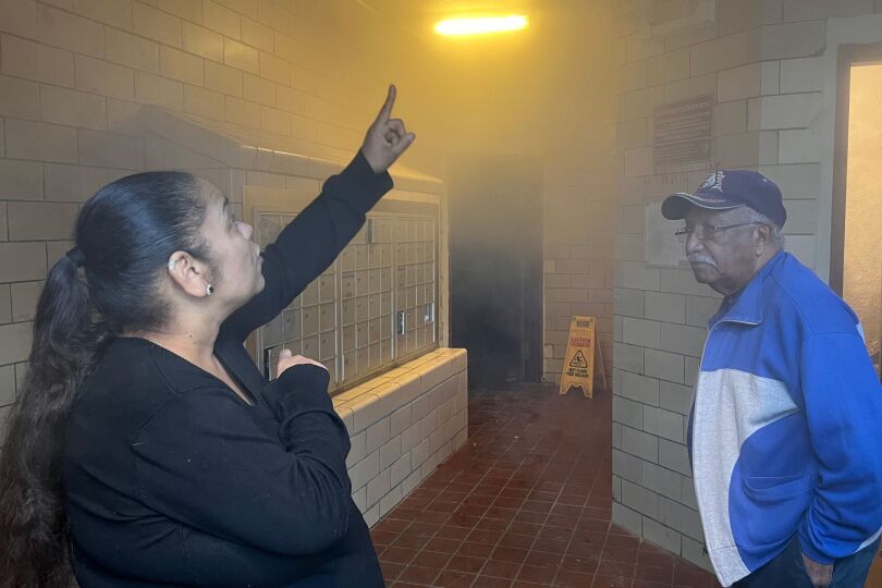 Baruch Houses resident Jeanette Chapel cautions residents about steam emanating from the boiler room, Dec. 14, 2022.